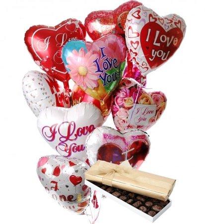 10 Heart Shaped Mylar Balloons and Box of Chocolates